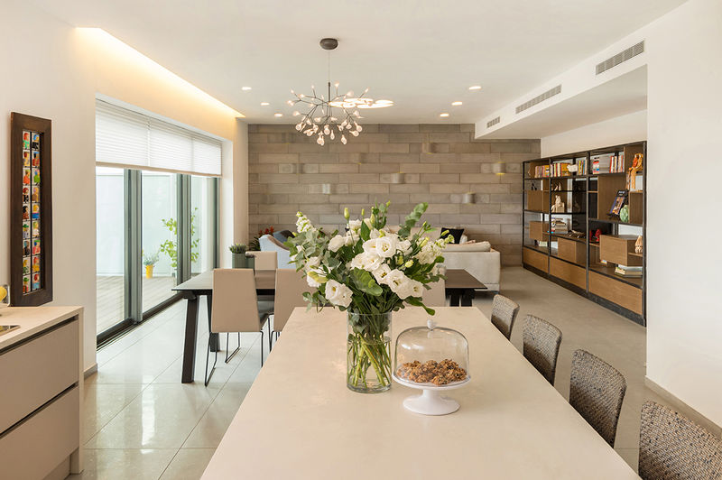 המטרה: דירה בקומה גבוהה במפלס אחד, יצירת אזור אירוח מרווח ומזמין למשפחה ולחברים שבאים בסופי שבוע להתארח.