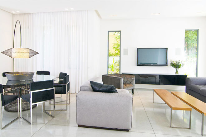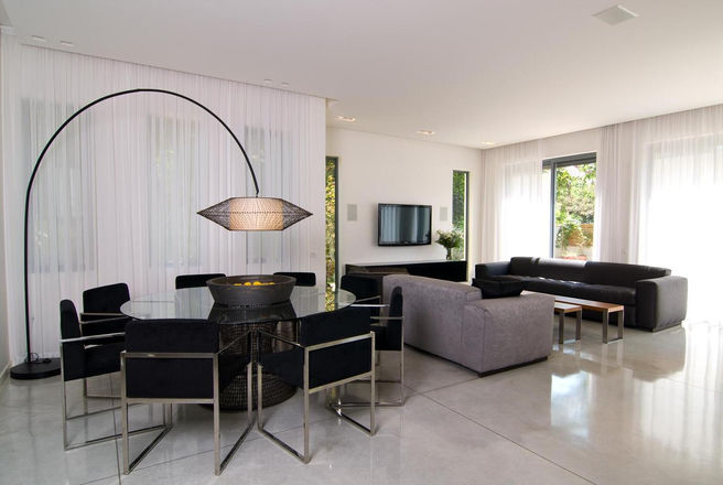 כדי ליצור ניקיון צורני היה חשוב למשפחה חדר מגורים מינימליסטי המשתקף במראה עשיר ונקי ,שולבו רהיטים בעלי טקסטורה עשירה כמו קטיפה בכיסאות ובד בספות המרככים את מראה הבטון ומעניקים מראה מפנק וחם.